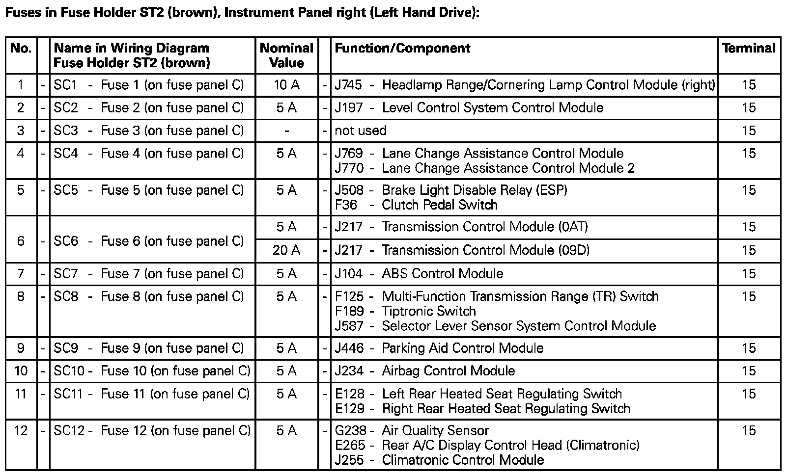 Fuses In Fuse Holder ST2 (Brown), Instrument Panel Right: