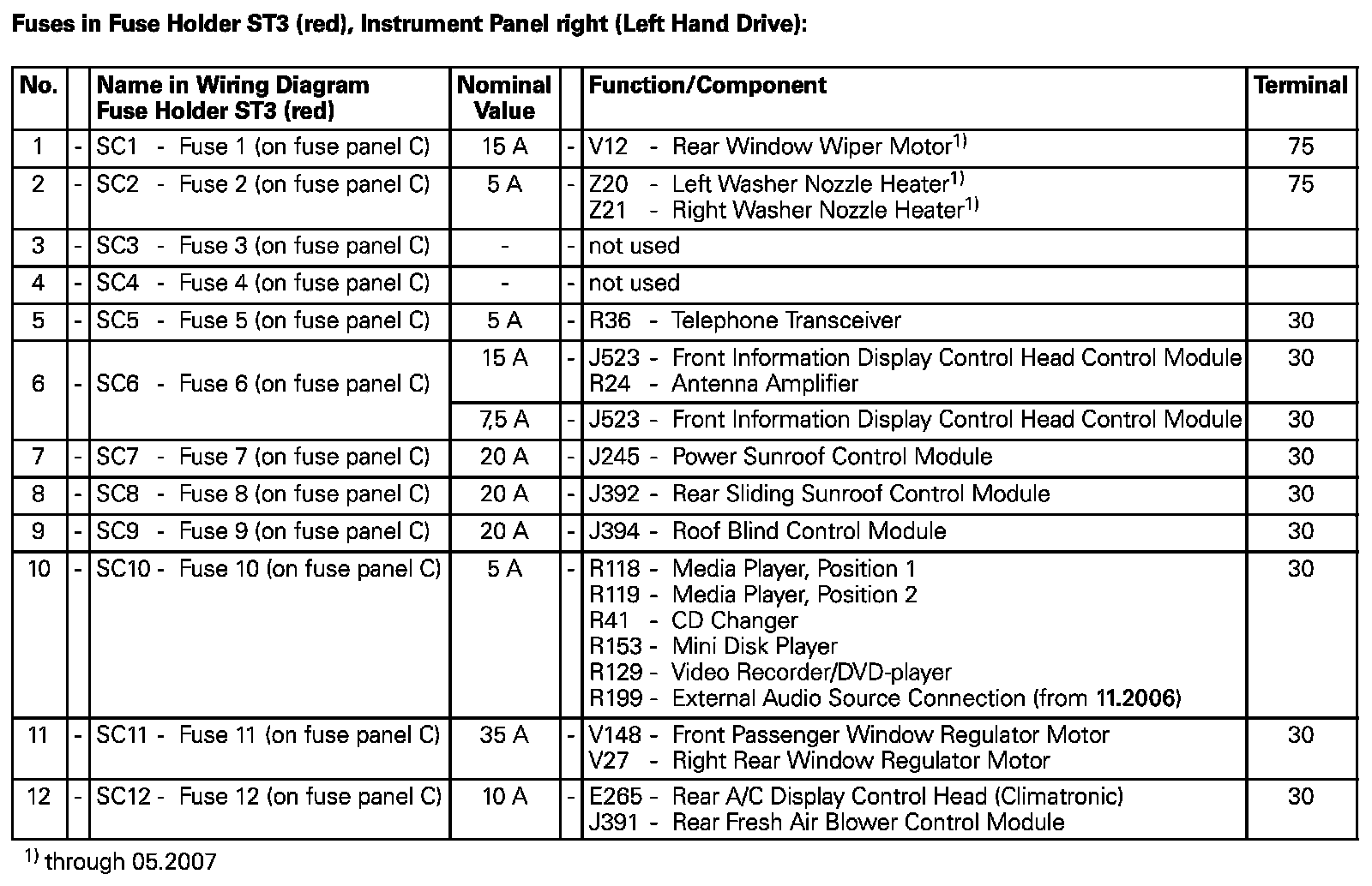 Fuses In Fuse Holder ST3 (Red), Instrument Panel Right: