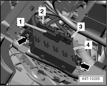 - Remove nuts - arrows - and remove vehicle electrical system control module - item 4 -.