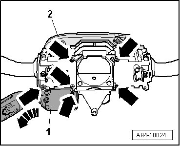 - Remove screws - arrows - and remove Steering Column Electronic Systems Control Module (J527) - item 2 - from steering column switch module.