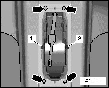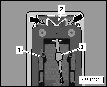 - Pull selector mechanism shift unit - 1 - back slightly and remove screws - arrows - on center bracket - 2 -.