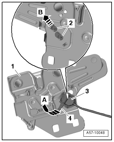 - Disengage the trunk lock/alarm/central locking switch (F124) - item 3 - in the - direction of arrow B - at the lid lock - 1 - and remove it.