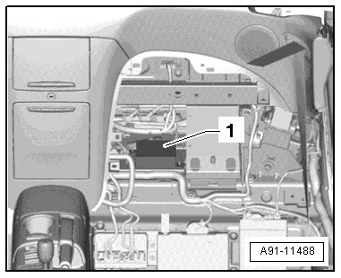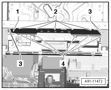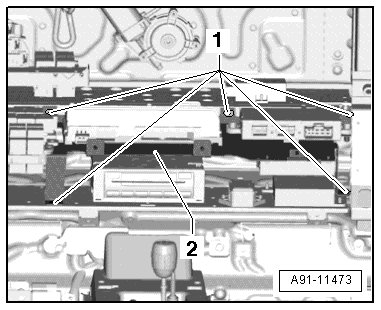 - Remove the bolts - 1 - on the bracket - 2 -. Move the bracket - 2 - upward and disconnect the connectors from the Satellite Radio (R146).