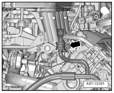 - Remove the bolt - arrow - on the retaining clamp for the high pressure side service connection refrigerant line.