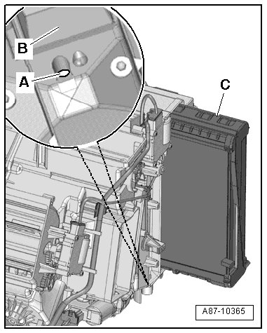 - Before installing the evaporator, check the water drain hose openings - A - (at the left and right in the A/C unit) for dirt and clean them if necessary.