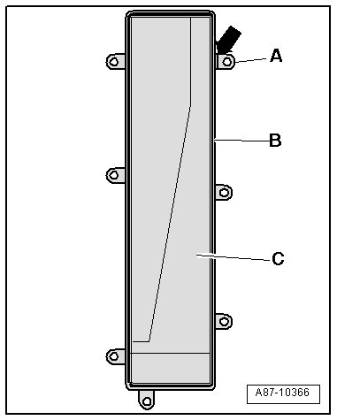 - Make sure the surrounding rubber seal - B - and plastic frame - C - are present.