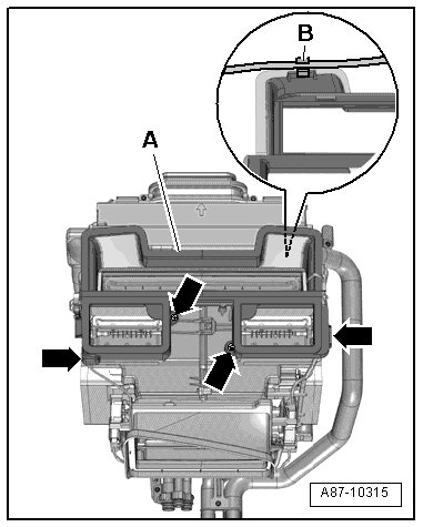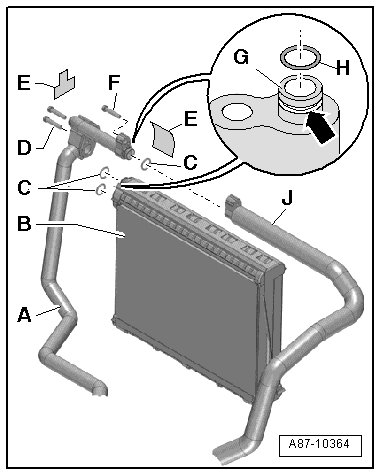 - Insert the O-ring seal in the groove - arrow - on the connection for the refrigerant line - A - and the evaporator - B -.