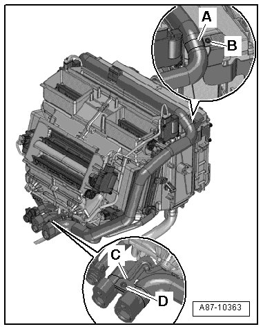 - Check the connections - G - for the refrigerant line - A - and the evaporator - B - for damage and ensure they are seated correctly.