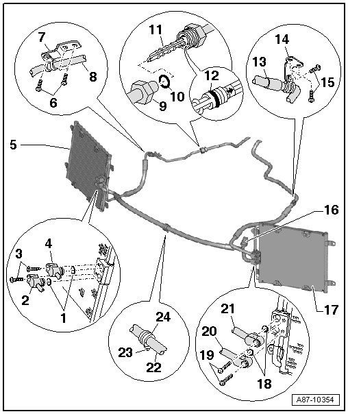 • Refrigerant line, disconnecting and reconnecting, refer to => [ Refrigerant Lines, Disconnecting from Condenser and Connecting ] Refrigerant Circuit.