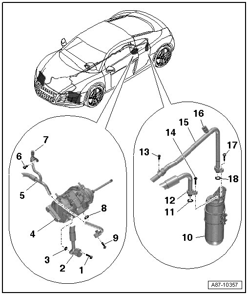 • V8 engine, removing and installing, refer to => [ Compressor ] Compressors. Vehicles with V10 engine, refer to => [ Compressor ] Compressors.