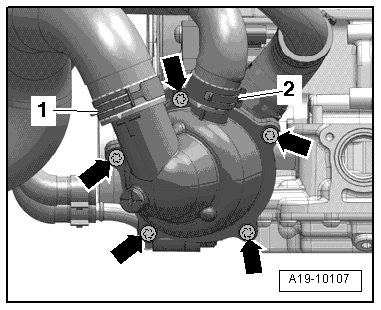 - Lay the coolant thermostat housing aside with the coolant hoses - 1 and 2 - connected.