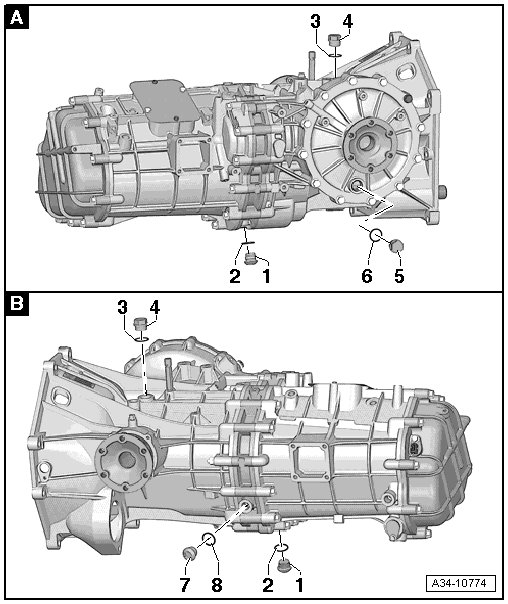 • There is no oil check plug - 7 - on the old transmission version. The transmission oil must be drained completely and the specified quantity added.