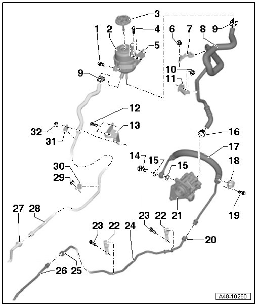 • Tension with the hose clamp pliers (V.A.G 1275) or locking pliers (VAS 6199).