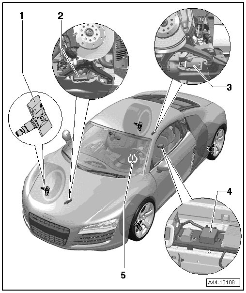 • If tires that were not saved in the system are installed or the tire pressure sensors are replaced, the tire pressure monitoring system control module (J502) => [ (Item 4) ] must be recoded.