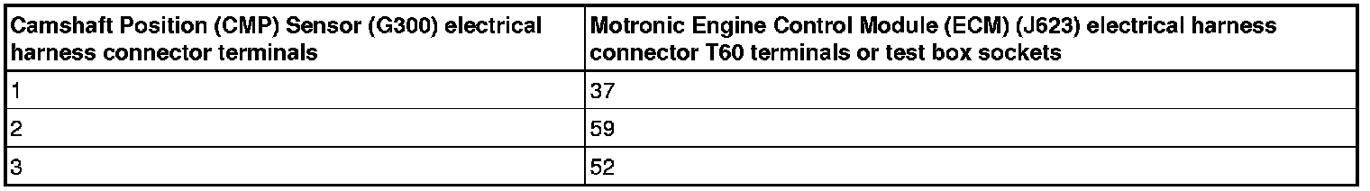 - Using a Multimeter, check the Camshaft Position (CMP) Sensor 3 (G300) electrical harness connector to the Motronic Engine Control Module (ECM) (J623) electrical harness connector T60 for resistance.