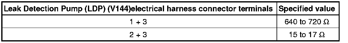 - Using a Multimeter, check the Leak Detection Pump (LDP) (V144) for resistance as follows: