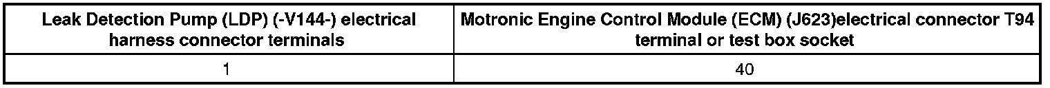 - Using a Multimeter, check the Leak Detection Pump (LDP) (-V144-) electrical harness connector terminals to the Motronic Engine Control Module (ECM) (J623) electrical harness connectors T94 and T60 terminals for resistance.