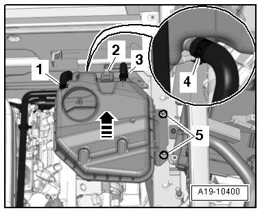 - Slide the coolant reservoir forward slightly - arrow - and remove it from the bracket.