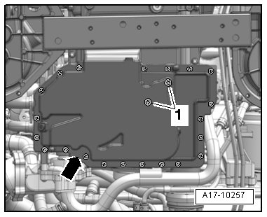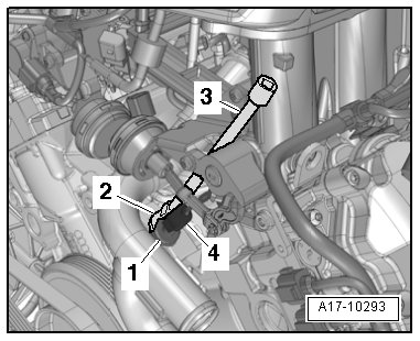 - Tighten the bolts on the flange - arrow - and intake tubes - 1 - in 3 stages as follows: