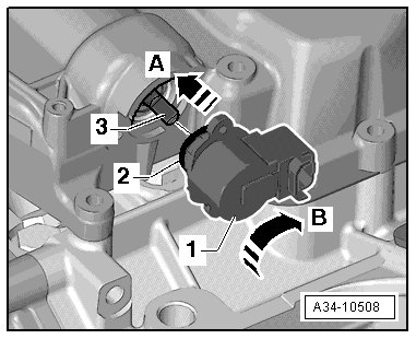 - Position the Gear Recognition Sensor (G604) - 1 - in the "9:00 position" on the R tronic shift actuator bolting eyelet - arrow A - as shown in the illustration.