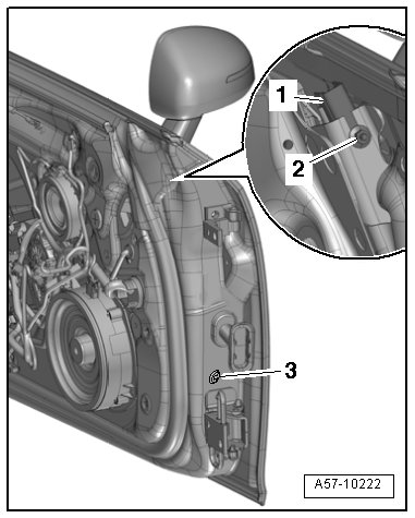 - Tighten the nut - 2 - and bolt - 3 - by hand. The window guide must still be able to move slightly.