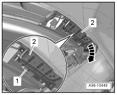 - Press the securing clip - 1 - to the side and slide the driver seat memory program control head (E97) - item 2 - in the - direction of the arrow - out of the door trim.