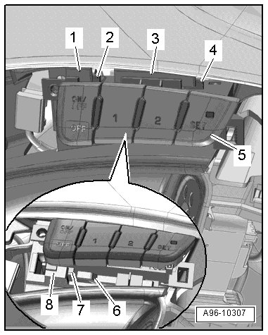 - Position the driver seat memory program control head - item 5 - on the door trim. The retainers - 2, 4 and 7 - must engage behind the guides - 1, 3 and 8 -.