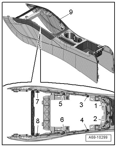 - Remove the bolts - 1 through 8 - and the center console trim panel - 9 -.