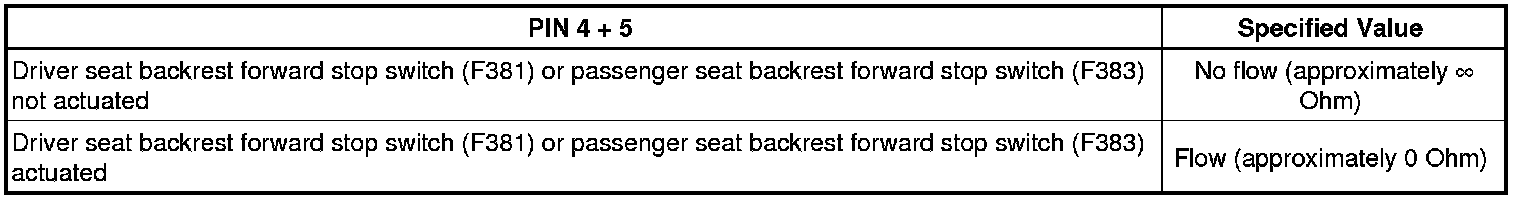 - Check the driver seat backrest forward stop switch (F381) or front passenger seat backrest forward stop switch (F383) using the multimeter (V.A.G 1526E) and connector lines from the connector test set (V.A.G 1594C).