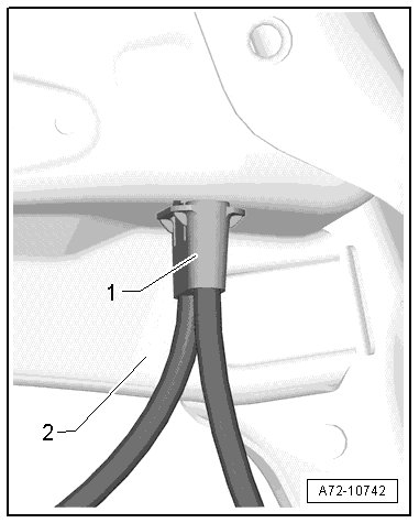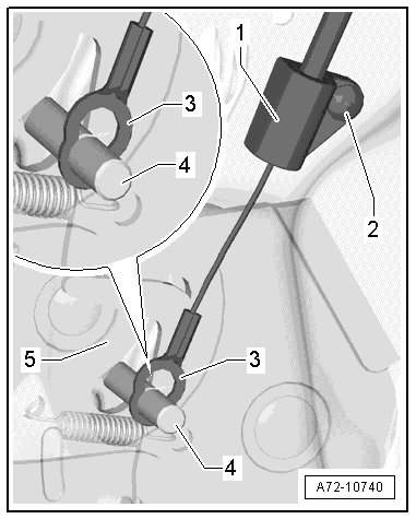 - Press the end of the release cable out of the bracket - 1 - in the direction of the- arrow -.