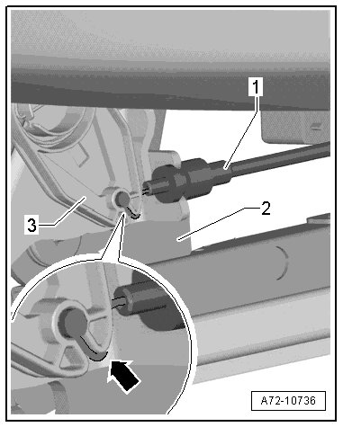 - Disengage the end of the release cable - arrow - at release cable retainer lever - 3 - of the seat forward/back adjuster.