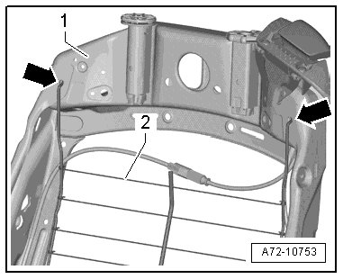 - Remove the spring mat - 2 - from the openings - arrow - in the backrest frame - 1 -.