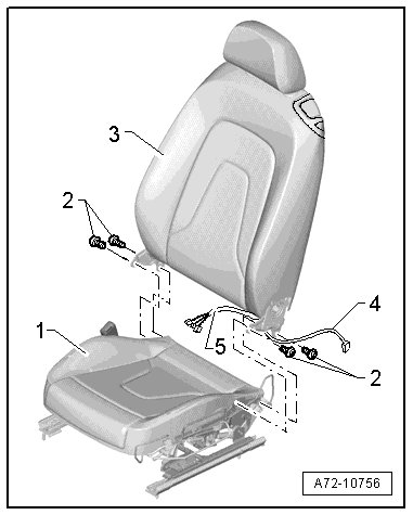 - Press the seat pan upholstery to the side and carefully remove side airbag wiring harness - 4 - and, if necessary, all additional wiring harnesses - 5 - to the backrest (depending on equipment) from the seat pan.