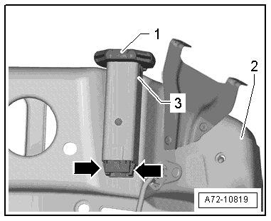 • When sliding the headrest guide - 1 - in, make sure the tab - 3 - engages correctly on the backrest frame - 2 -.