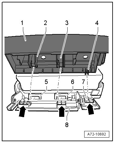 - Tilt the internal padding - 1 - down and guide the retaining hooks - 2 -, - 3 - and - 4 - into the tabs - 5 - and - 6 - and the opening - 7 -.