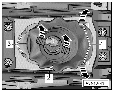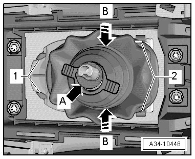 - Release the tabs - 1 - in direction of - arrow -. Raise the rear noise insulation when doing this.