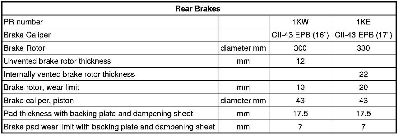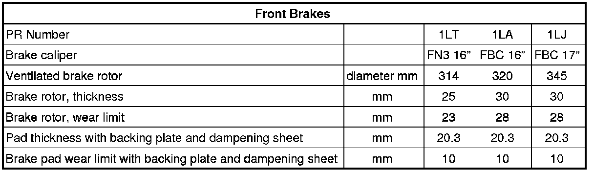 The following tables show the PR number code key. This is important in order to know the brake caliper/brake rotor and brake pad combination.