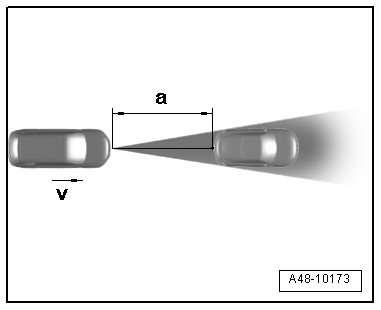 • A vehicle in front in the same lane (red) is recognized by the distance regulation control module, which then sends the changed specified acceleration to the engine control module in order to hold the specified distance. The engine control module decides if it should either increase or decrease the amount of fuel being injected in order reach the specified acceleration or if it should activate the brakes (performed by the ABS control module). The speed "V" of the blue vehicle is reduced so that the distance "a" can be set.
