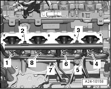 - Remove high pressure line - 7 - from connector on fuel rail. To do this, counterhold at hex head with and open-end wrench and loosen the union nut.