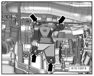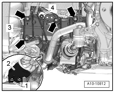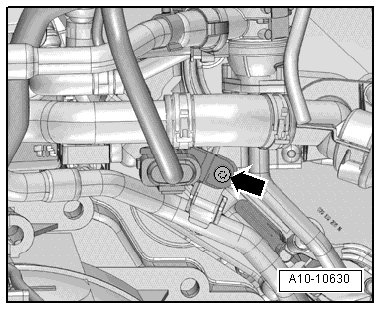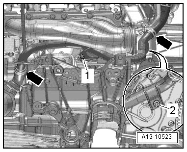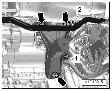 - Remove the bolt - 2 - and lower left coolant pipe from the coolant hoses - arrows -.