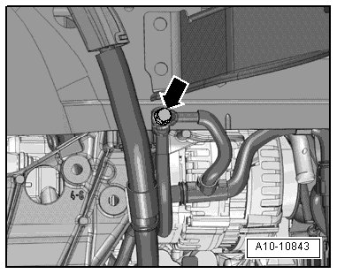 - Remove the nut - arrow - on the right longitudinal member and free up the ground wires.