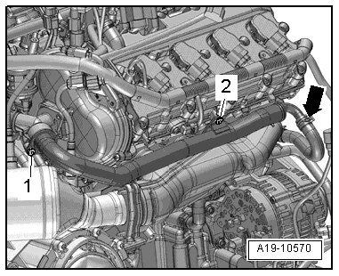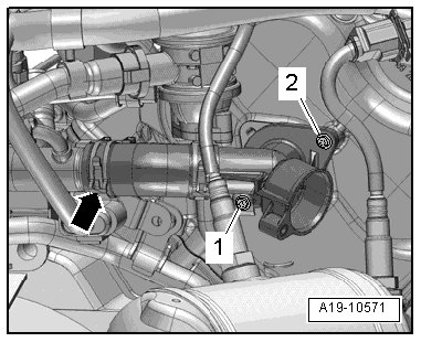 - Remove the bolts - 1 and 2 - and the coolant hose - arrow -.