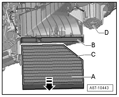 - Install the dust and pollen filter - A - on the correct side ( the angle - C - on the side facing the fresh air blower - D -)