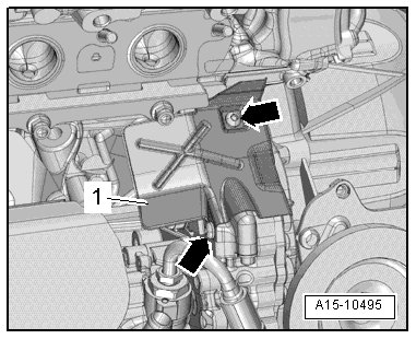 - Remove the bolts - arrows - and the heat shield - 1 -.