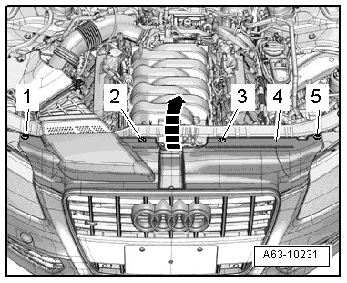 - Remove the cover - 4 - from the lock carrier and disengage the radiator grille.