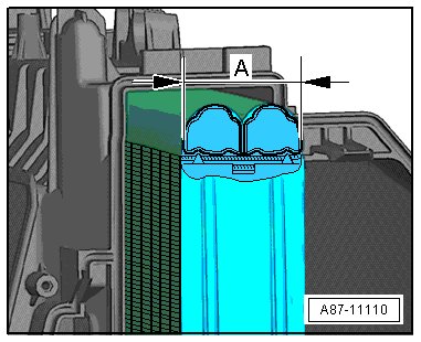 • Evaporators with a block depth - A - of approximately 40 mm (1.6 in) (air conditioner part number "8K_ 820 005") are being installed from start of production through the change-over from MY 12. These evaporators can be replaced with the air conditioner still installed. From MY 12, Evaporators with a block depth - A - of approximately 50 mm (2 in.) are being installed (air conditioner part number "8T_ 820 005") as a running change depending on the vehicle version. These evaporators can be replaced only with the air conditioner removed together with the evaporator housing. Refer to the Parts Catalog.