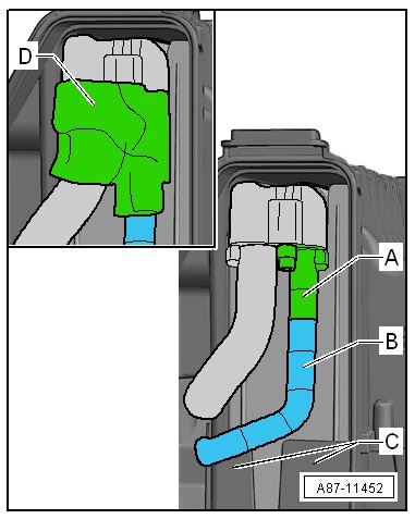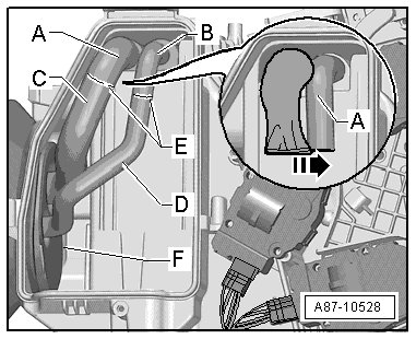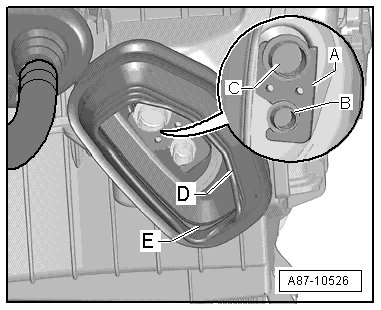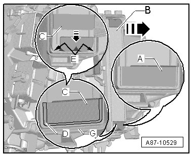 • If the refrigerant pipe wrapping - B - touches the separating walls of the evaporator housing - C - on an Audi Q5 hybrid, rework the walls, if necessary.