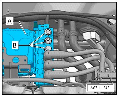 - Install the cover for the evaporator refrigerant lines - B - and the bolt - A -.