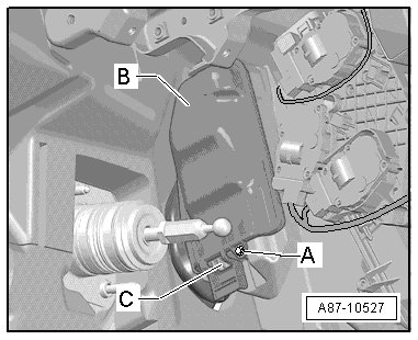 - Loosen the locking mechanism - C - and remove the cover for the refrigerant lines leading to the evaporator - B -.