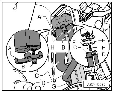 • The refrigerant lines - C - and - D -, the O-rings - E - and - F -, the bracket - A - and the bolt - B - and - H - are all included in the replacement evaporator kit. Refer to Electronic Parts Catalog (ETKA).